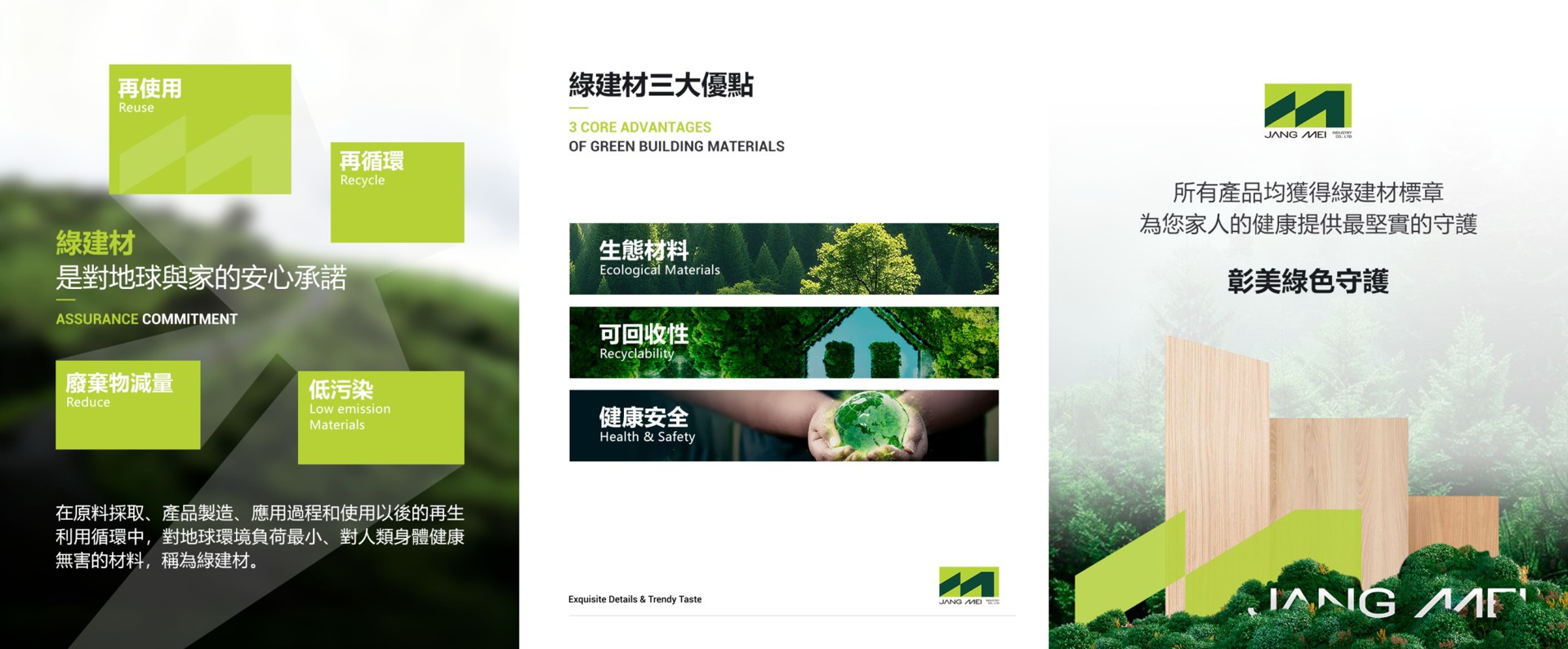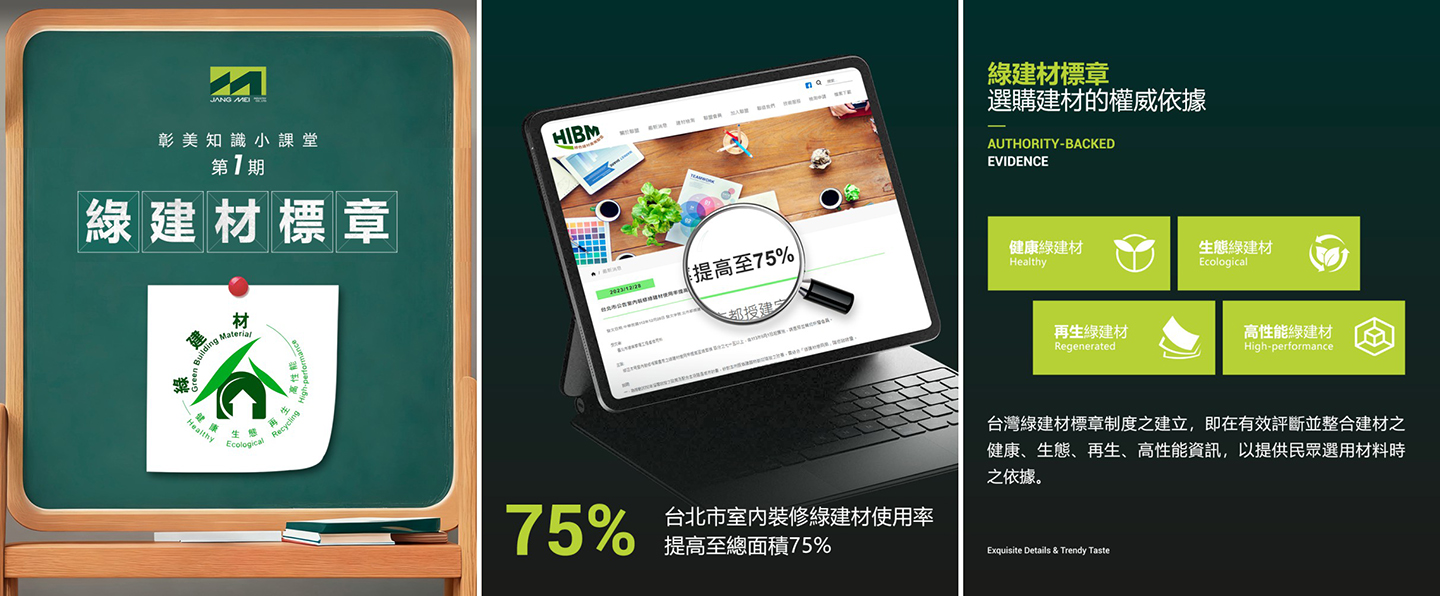 【到底什麼是綠建材標章?】台灣綠建材標章自 2004 年上路,即在有效評斷並整合建材之健康、生態、再生、高性能資訊,以提供民眾選用材料時之依據。而綠建材,就是在原料採取、產品製造、應用過程和使用以後的再生利用循環中,對地球環境負荷最小、對人類身體健康無害的材料。綠建材有 3 大優點:1. 生態材料:減少化學合成材之生態負荷與能源消耗。2. 可回收性:減少材料生產耗能與資源消耗。3. 健康安全:使用自然材料與低揮發性有機物質建材,可減免化學合成材之危害。